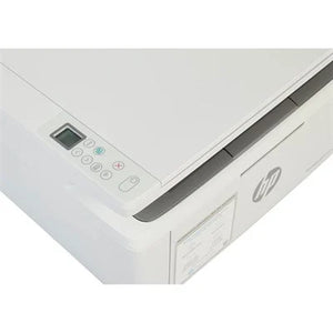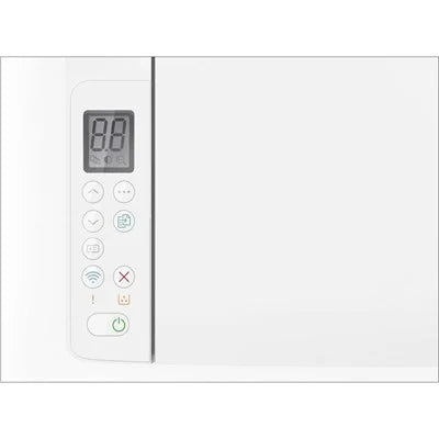 Compact multifunction laser printer with fast setup via HP Smart app, mobile printing support, and Auto-On/Auto-Off technology for resource efficiency.
